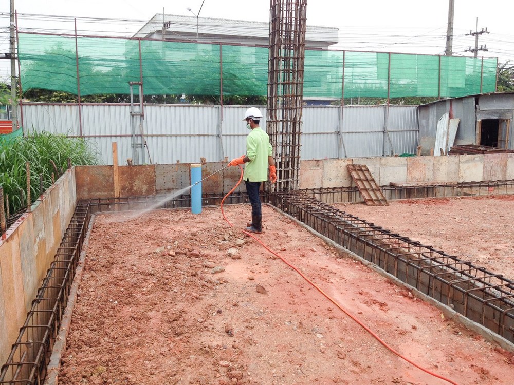 อาคารพื้นถมเต็ม (SLABS ON GROUND) หลังจากที่ฝ่ายก่อสร้างได้ทำการปรับพื้นที่และพร้อมที่จะเทคอนกรีต (อาจก่อนหรือหลังงานผูกเหล็กก็ได้) เก็บเศษไม้ ตอไม้ และเศษขยะต่าง ๆ ที่เป็นเชื้อปลวกใต้ดินออกหมดเรียบร้อยแล้ว บริษัทฯ จะส่งเจ้าหน้าที่เข้ามาทำการอัดฉีดพ่นน้ำยาเคลือบผิวหน้าดินบริเวณภายในอาคารทั้งหมด โดยใช้หัวอัดฉีดพื้นผิว (SURFACE PRAYER) ฉีดพ่นแบบปูพรมครอบคลุมทุกตารางนิ้ว และอัดน้ำยาลงดินบริเวณฐานของตัวอาคาร อัดน้ำยาลงใต้ดินในระดับลึกประมาณ 1-1.5 ฟุต ห่างจากรากฐานอาคารหรือตอม่อประมาณ 20 ซ.ม. และทิ้งระยะห่างต่อจุดประมาณ 1 เมตรตามแนวยาว
